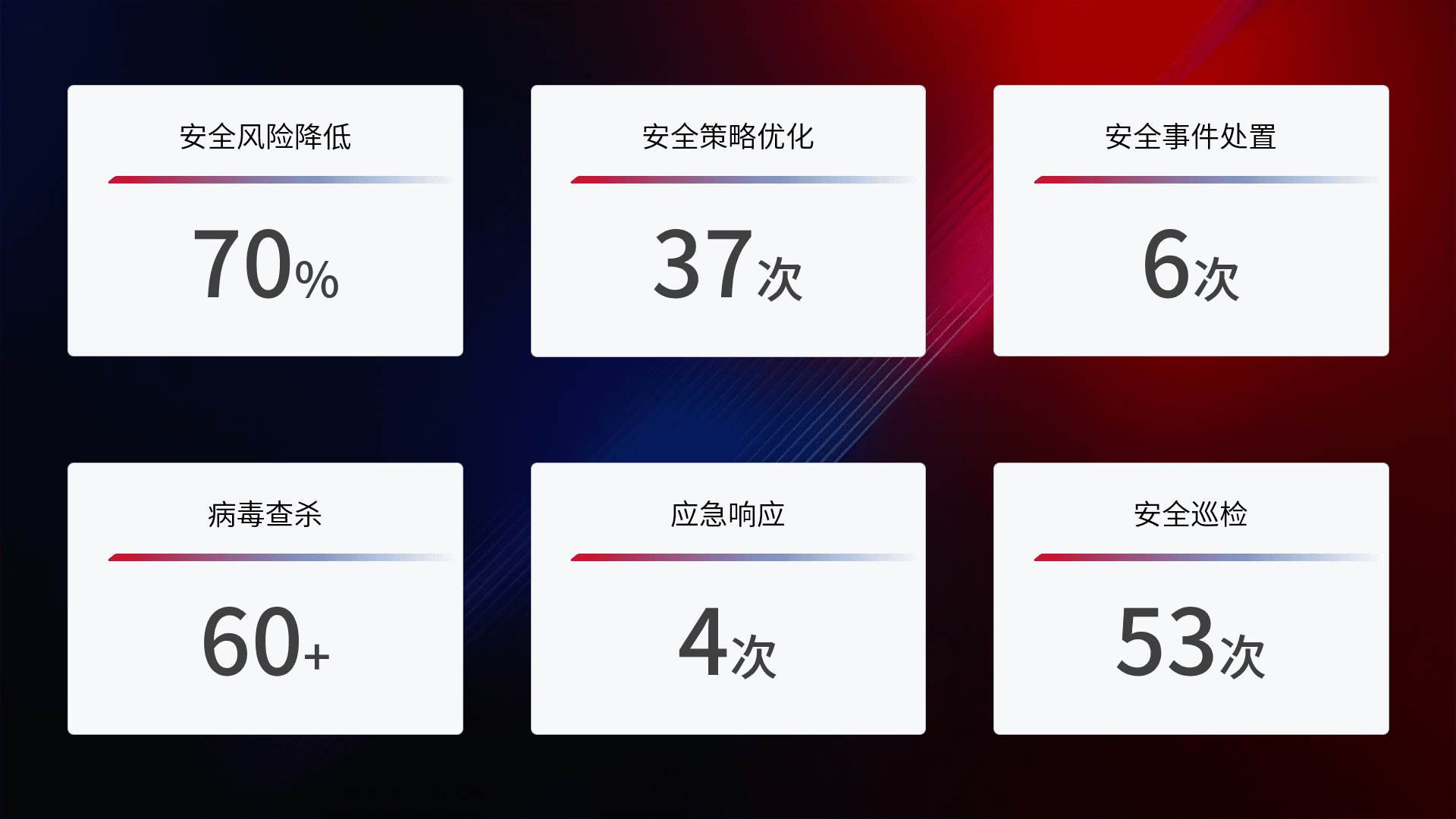 提供全面的安全事件报告体系,,包括处置报告、、、周报、、、季度和年度总结,,,,结合持续监控,,,帮助客户深入了解网络安全状况。。。。