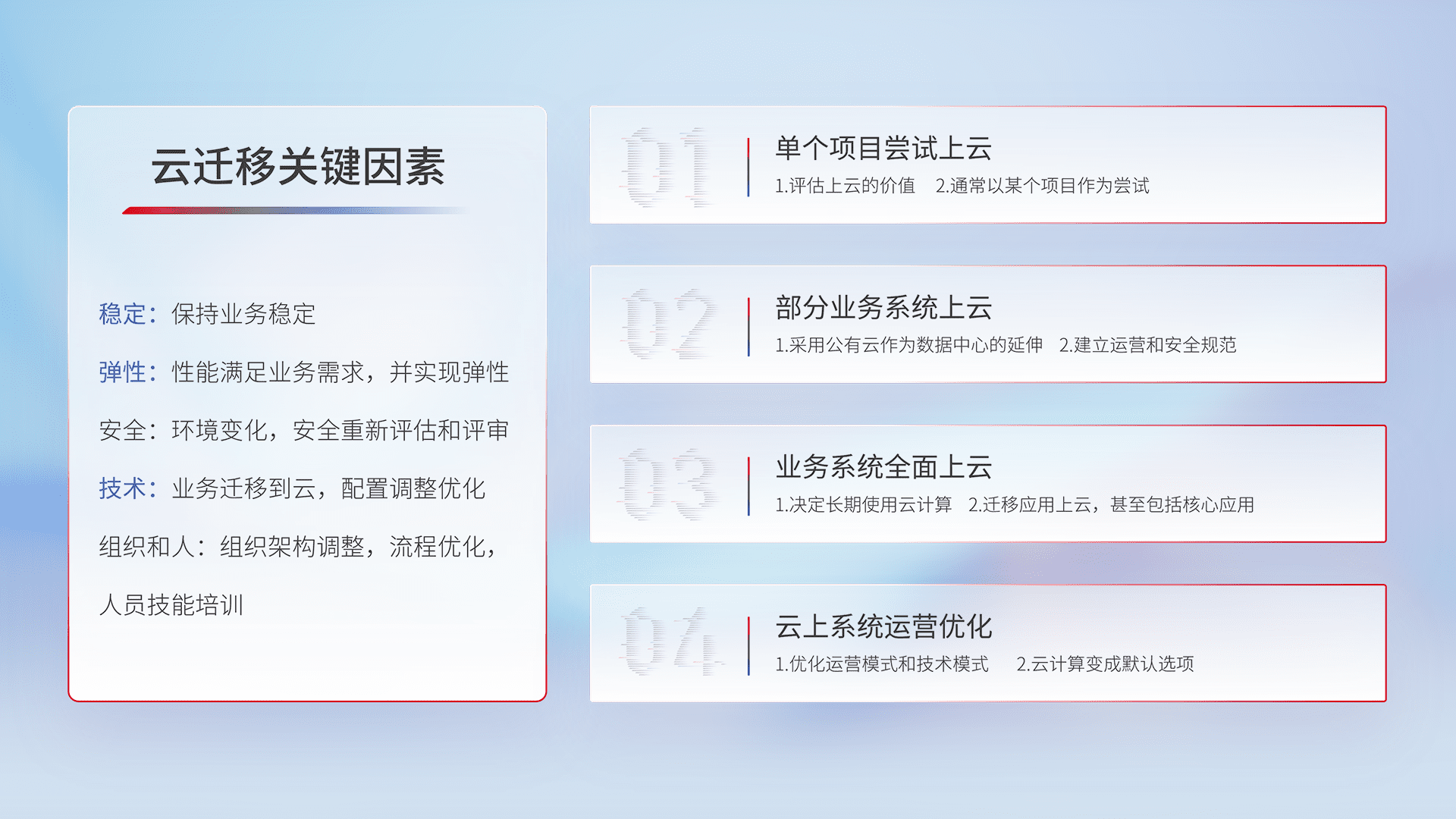 结合实际业务,,,从规划设计、、云平台选型、、云原生改造、、、、数据迁移、、、集成交付,,迁移全过程为客户识别最佳上云路径,,做好风险识别管理,,,设计网络架构、、身份权限、、、安全审计合规、、操作审计、、日志审计、、监控告警策略、、多站点容灾设计等,,对云上基础设施进行整体规划,,,,提升IT治理水平,,,以满足弹性、、高可用、、高性能的需求。。。。